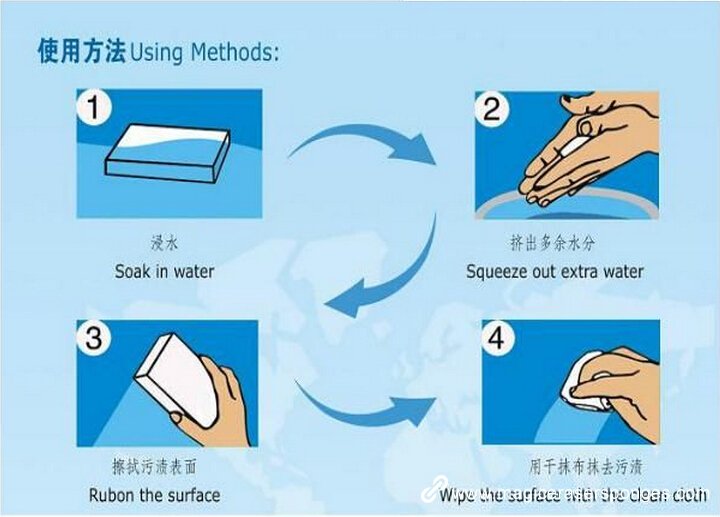 Шаг 5: будет использовать волшебную губку в воду после замачивания, не нужно втирать, грязный может раствориться, неоднократно используется снова.