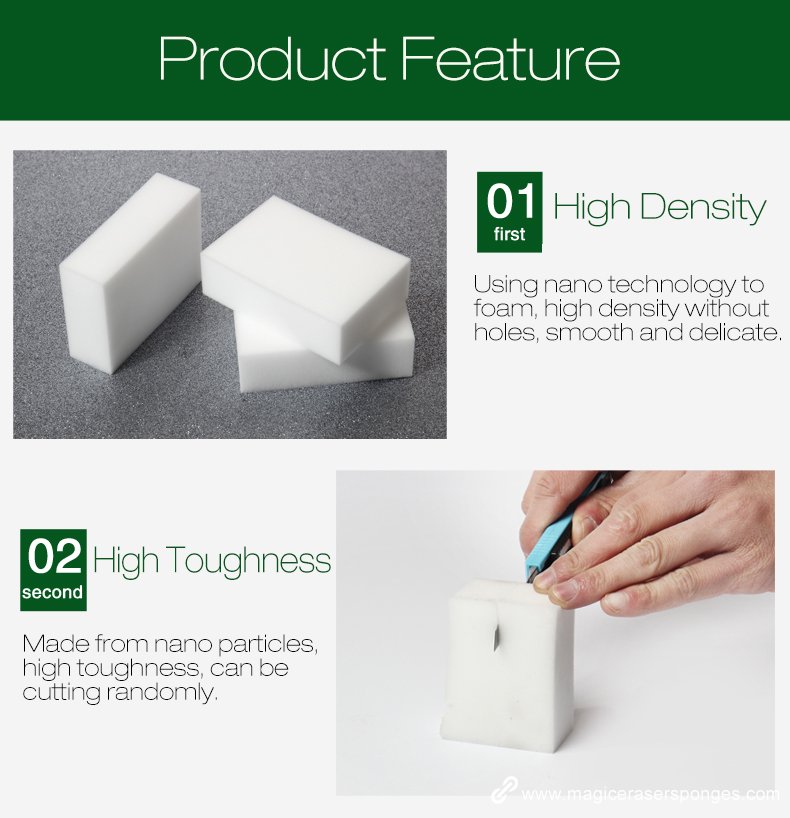 Меламиновая губка, твердое структурное многоуровное тело из меламиновых гранул, является своего рода экологически чистым продуктом. Это характеризуется безвкусностью, невиновностью и безвредностью. В отличие от традиционной чистящей губки, каждая гранула, которая представляет собой десять тысяч волос тонкой, действуя как чистая, удаляет упрямых пятна своей художественной силой. В то же время его структура капиллярных пор может эффективно удалять упрямые пятна. Это процесс самоуничтожения, чтобы достичь удивительного чистого эффекта. Не забывайте, вам не нужно химическое моющее средство, которое следует смыть гораздо большим количеством воды! Подходит для неровной поверхности, экономии времени, экономии труда, экономии воды и без царапин, это ваш лучший выбор в работе по дому.